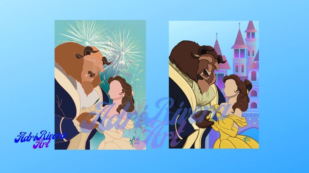 Las he dibujado digitalmente, son dos láminas tamaño A4 (folio), una con fondo de fuegos artificiales y otra con castillo